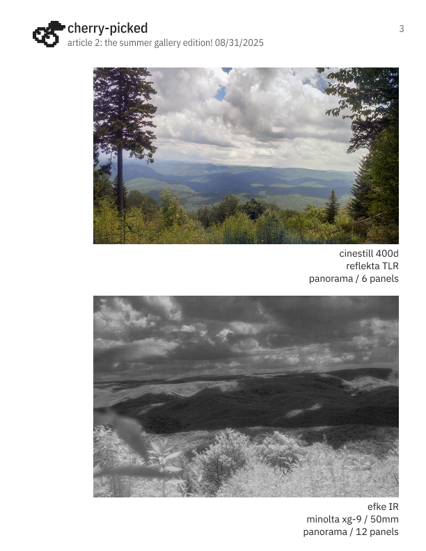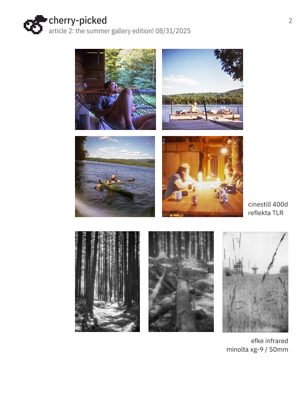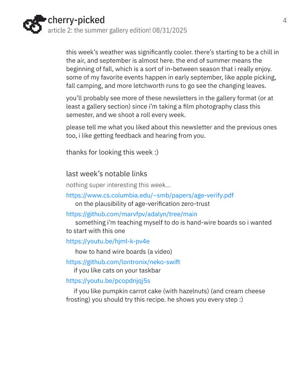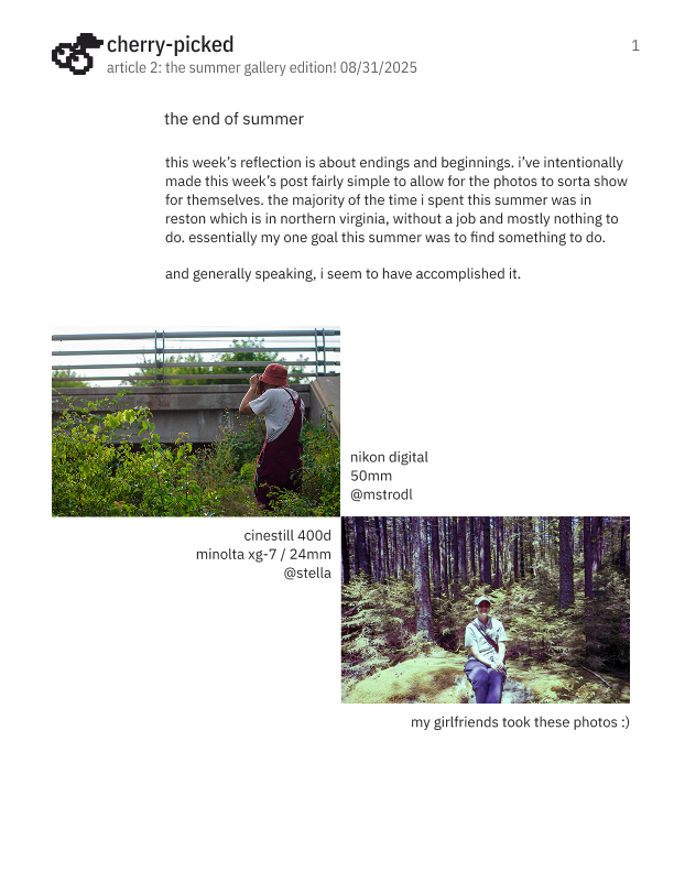 Cherry-Picked is my new (as of August 2025) weekly newsletter that updates every month. I designed these as a way to reconnect with many different friends near and far, all over the world, and share what I've been up. It also serves as a space to display my photos as a hobbyist film and digital photographer as well as interesting links I've collected while existing on the internet.